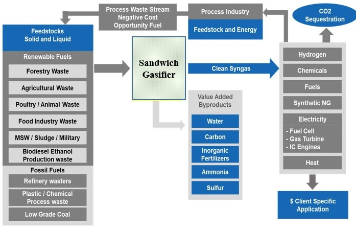 Smart Waste Converters use a Sandwich Gasifier to vaporize complex waste materials into